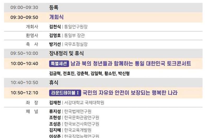 이번 행사는 개회식, 특별세션, 그리고 3개의 라운드테이블 세션으로 구성된다. 개회식에서는 김천식 통일연구원장의 개회사와 김영호 통일부 장관의 환영사가 예정되어 있으며, 김 장관은 체계적인 ‘통일연구 생태계’의 중요성을 강조할 예정이다.