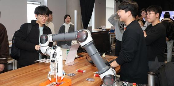 새로 개관한 인공지능(AI) 교육연구 공간인 해동첨단공학관의 AI 로봇 클러스터에서는 40여 명의 연구원들이 로봇을 시연했다. 특히 입구에서 안내봇 역할을 맡아 사람이 손을 내밀면 센서로 인식해 잡아주는 ‘휴머노이드 로봇’과 처음 인사를 나눈 참석자들은 사람이 직접 입을 수 있는 ‘웨어러블 로봇’을 접하는 시간을 가졌다.