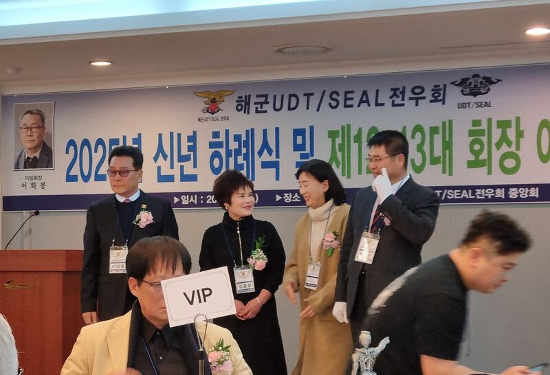 해군 UDT/SEAL(희생•명예•단결) 전우회는 지난 4일 오후 5시부터 서울 해군호텔 아일랜드홀에서 신년 하례식 및 이·취임식을 개최했다. 이번 행사에는 전국 각지의 전우회 회원들이 참석하여 행사의 의미를 더했다. 정장 혹은 단정한 복장을 착용한 회원들은 서로의 안부를 확인하며 새해 인사를 나눴다.