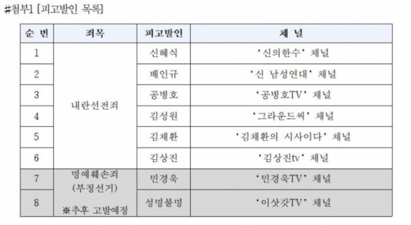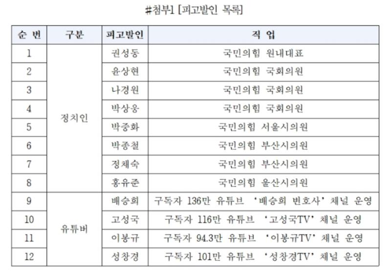 ♦ 민주당이 내란선전, 명예훼손 등 혐의로 고발한 정치인, 언론인 등(자료=민주당 '민주피출소' 갈무리)