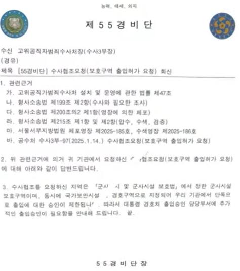 국민의힘은 공수처와 경찰 등이 포함된 공조수사본부(이하 공조본)가 조직적으로 범죄를 저질렀다고 주장했다. 서 대변인은 "공조본은 추가 조사를 빌미로 55경비단장을 압박해 허위 공문서를 작성했다"며 "55경비단장은 공조본의 압박과 강요로 인해 관저 출입 허가에 필요한 ‘관인’을 내줬다고 한다"고 밝혔다. 그는 이어 "이러한 누더기 공문서는 법적 효력이 없는 명백한 위법"이라며 "이는 단순 실수가 아닌, 철저히 계획된 범죄 행위"라고 강조했다.