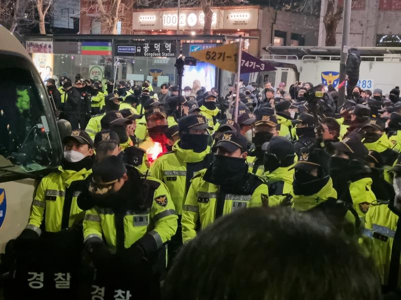 ♦ 서울서부지방법원 인근 공덕역에서 윤석열 지지 10만여 국민들의 질서 유지를 위해 애쓰는 경찰 공무원. 사진=배영남 기자)