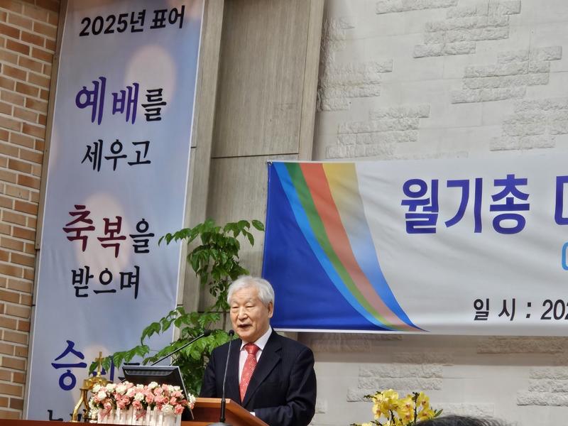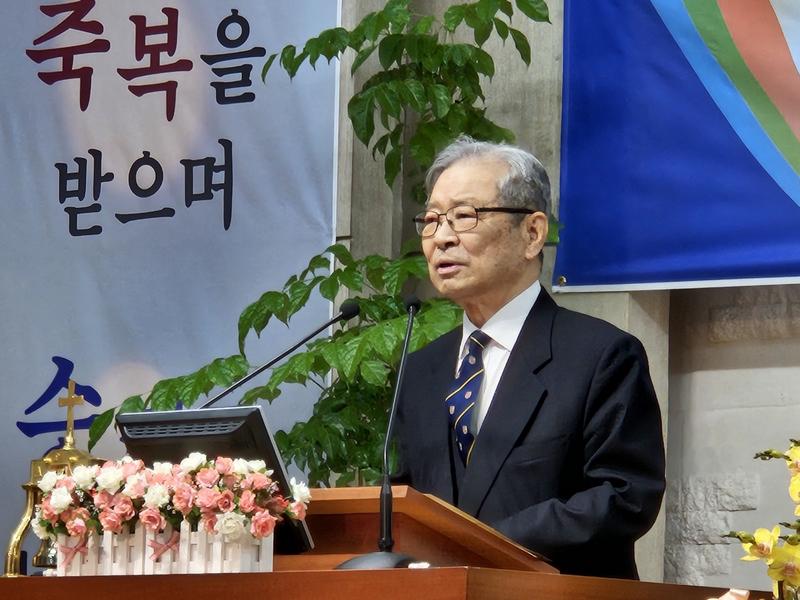 ♦ 민경배 박사(전 서울장신대 총장, 연세대 교수)는 축사를 통해 김 대표 총재의 취임을 축하하며 그의 리더십에 대한 기대를 표했다.(사진=민경베 박사, 윤주남 목사 자료 제공)