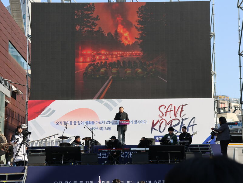 개신교 단체 ‘세이브코리아’는 11일 오후 1시 경부터 천안종합터미널 앞 대로에서 ‘충남 국가비상기도회 및 도민대회’를 개최했다. 국민 약 1만 5천 여명이 집회에 참여했으며, 많은 참석자가 태극기와 성조기를 흔들며 “대통령 탄핵 반대”를 외쳤다. 집회장 곳곳에는 ‘대통령을 석방하라’, ‘부정선거 검증하라’, ‘계엄합법 탄핵무효’ 등의 문구가 적힌 팻말이 내걸려 분위기가 고조됐다.