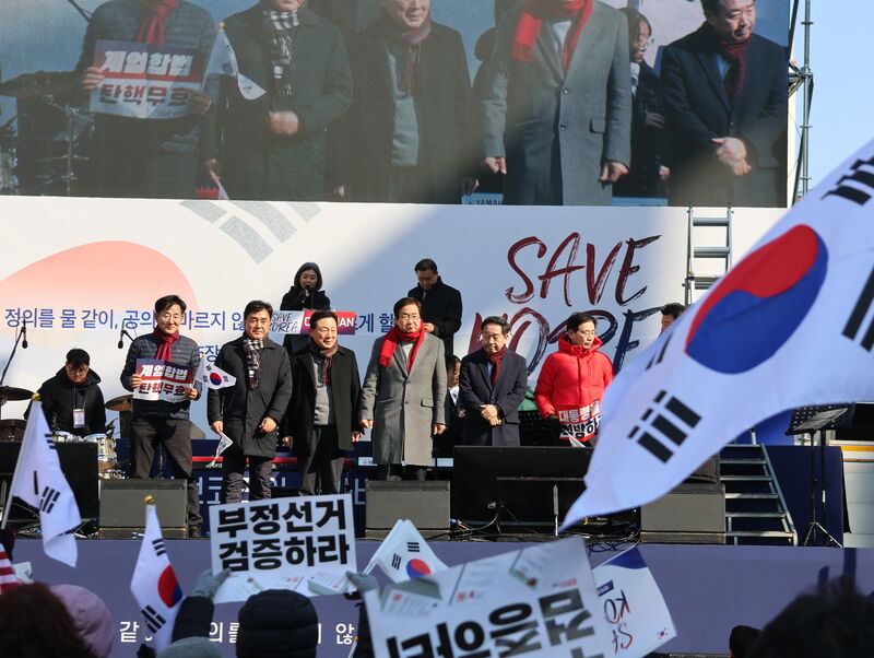 ♦ 이번 집회에서 가장 주목받은 연설자는 한국사 일타강사로 알려진 전한길 씨였다. 그는 연단에 올라 “좌파의 거대 사조직이 대통령을 부당하게 잡아가려는 것에 분노했다”고 주장하며, “무죄 추정의 원칙을 무시한 탄핵은 민주주의에 반하는 행동”이라고 강조했다.(사진=최재영 기자)