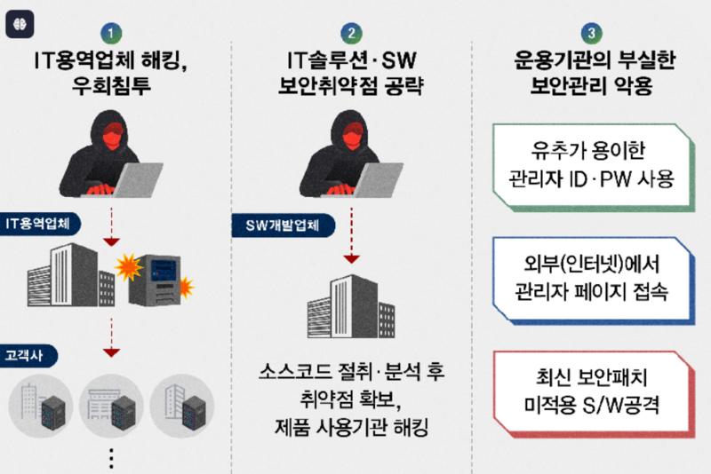 국정원에 따르면 북한 해킹조직은 주로 ① IT 용역업체를 해킹해 기관·기업의 전산망을 우회 침투, ② IT 솔루션 및 S/W 취약점을 악용한 내부망 침투, ③ 기업·기관의 부실한 보안 관리를 노린 해킹 등 세 가지 방식으로 공격을 시도하고 있다.