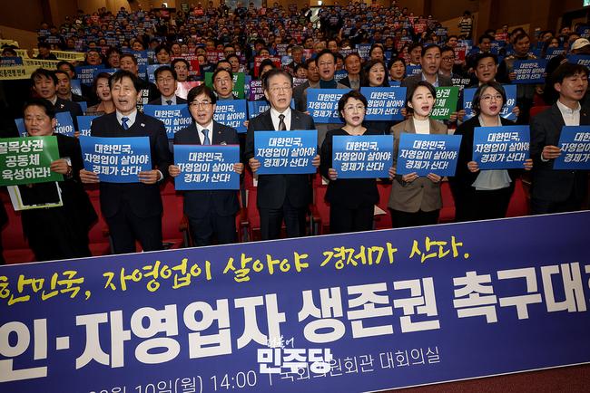이재명 더불어민주당 대표가 10일 국회에서 열린 ‘중소상공인·자영업자 생존권 촉구대회’에 참석해 정부의 경제정책 변화를 촉구했다. 이 대표는 이날 인사말에서 "자영업자는 국가경제의 모세혈관과 같다"며 "정부 정책이 국민의 삶과 직결된다는 점을 명심해야 한다"고 강조했다.