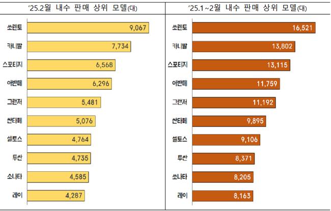 2월 자동차 생산량은 전년 동월 대비 17.1% 증가한 35.2만 대로, 2014년 2월(36.1만 대) 이후 11년 만에 35만 대를 넘어섰다. 수출도 17.3% 증가한 23.3만 대, 수출금액 기준으로는 17.8% 증가한 60.7억 달러를 기록하며, 연간 2월 기준 처음으로 60억 달러를 돌파했다.