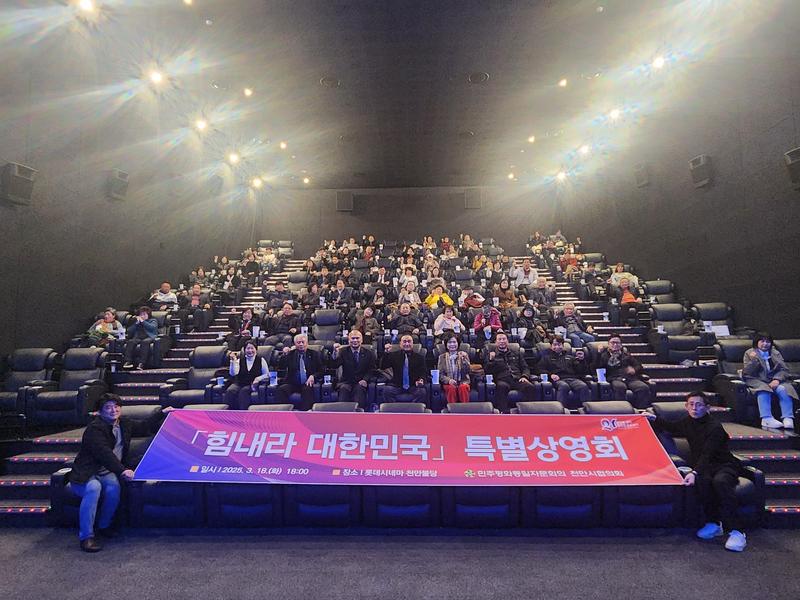 [천안=이노바저널] 민주평화통일자문회의 천안시협의회(협의회장 안상국)는 지난 3월 18일(화) 오후 6시, 롯데시네마 천안불당에서 ‘힘내라 대한민국’ 특별상영회를 개최했다. 이번 행사에는 자문위원, (사)충청희망포럼 회원, 지역주민 등 100여 명이 참석해 대한민국의 현대사를 되새기는 뜻깊은 시간을 가졌다.