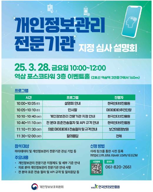 개인정보보호위원회와 한국인터넷진흥원이 오는 3월 28일(금), 서울 포스코타워 이벤트홀에서 ‘개인정보관리 전문기관 지정심사 설명회’를 개최한다.