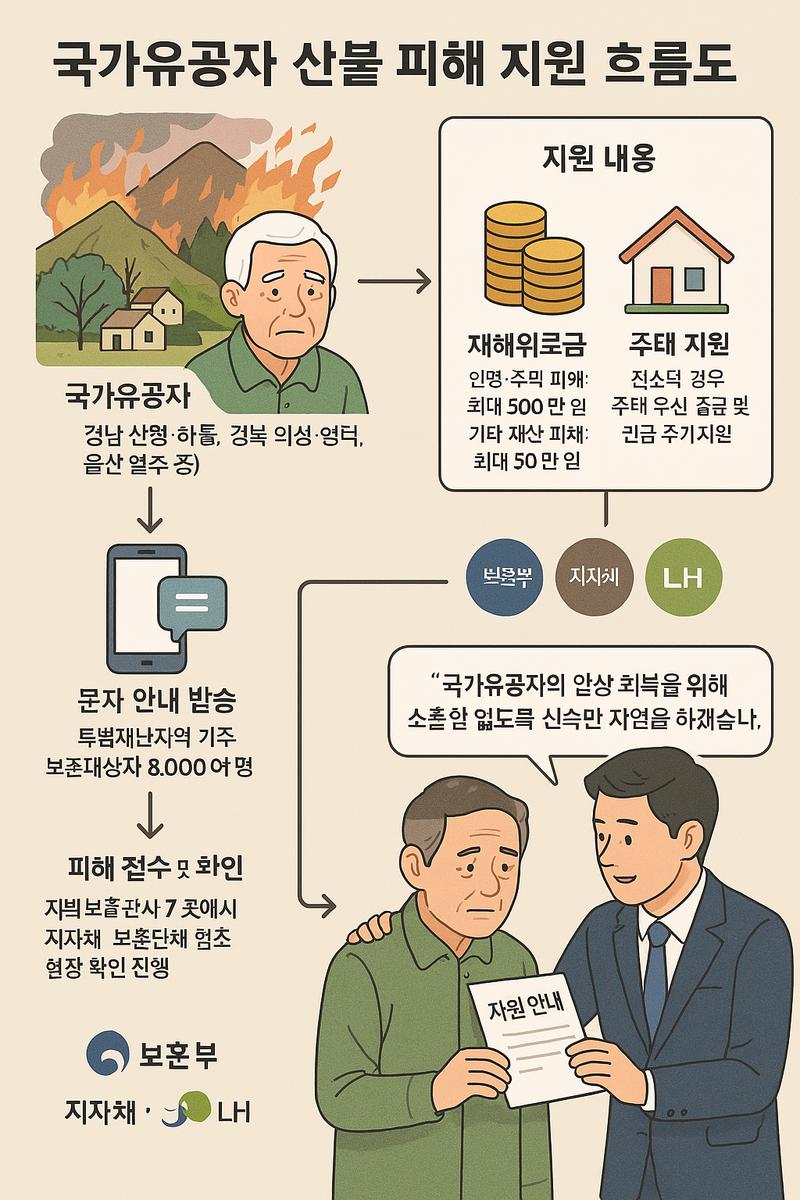 국가보훈부는 경상북도와 경상남도 일대에서 발생한 대형 산불로 피해를 입은 국가유공자와 그 유족을 대상으로 재해위로금 및 주택우선공급 등의 긴급 지원에 나섰다.