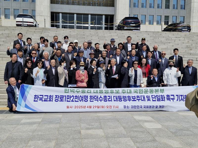 (서울=이노바저널) 한덕수 대통령 권한대행 겸 국무총리를 대통령 후보로 추대하려는 움직임이 본격화되고 있다. 2025년 4월 29일 국회의사당 본관 앞에서는 한국교회 장로 1만 2000명이 참여한 '한덕수 총리 대통령 후보 추대 및 단일화 촉구 기자회견'이 열렸다.