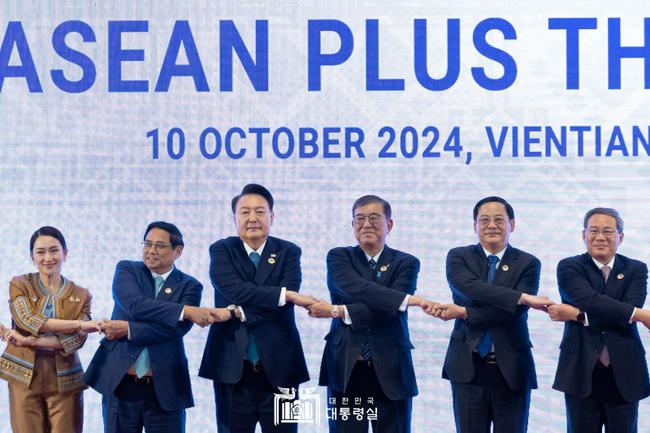 아세안(동남아국가연합) 정상회의 참석 차 라오스를 순방 중인 윤석열 대통령이 10일 비엔티안 국립컨벤션센터에서 열린 `아세안+3` 정상회의에서 각국 정상들과 기념촬영을 하고 있다. 왼쪽부터 패통탄 친나왓 태국 총리, 팜민찐 베트남 총리, 윤 대통령, 이시바 시게루 일본 총리, 손싸이 시판돈 라오스 총리, 리창 중국 국무원 총리.