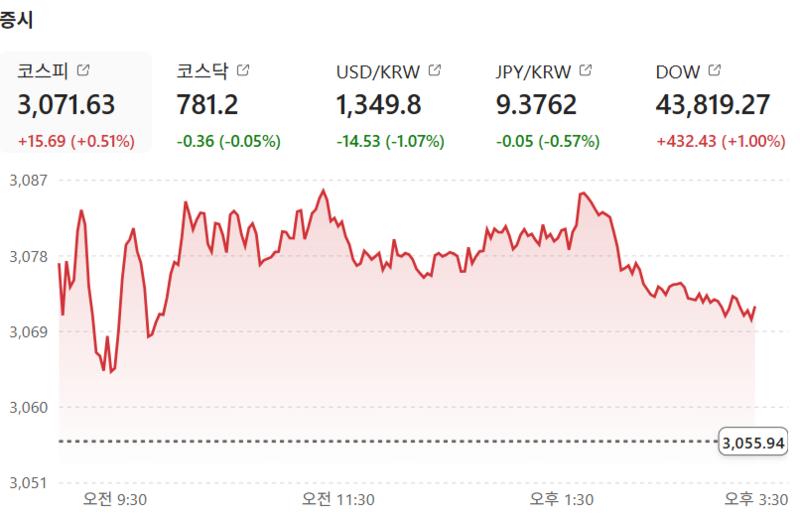 30일 한국 증시는 미국 증시의 호조와 미 연준의 금리 인하 기대감 속에 상승세를 유지했다. 이날 코스피는 전 거래일보다 15.69포인트(0.51%) 오른 3,071.63에 장을 마감했다. 장 초반 3,078선까지 오르는 등 강세를 보였으나 오후 들어 상승폭을 다소 줄이며 마감했다.
