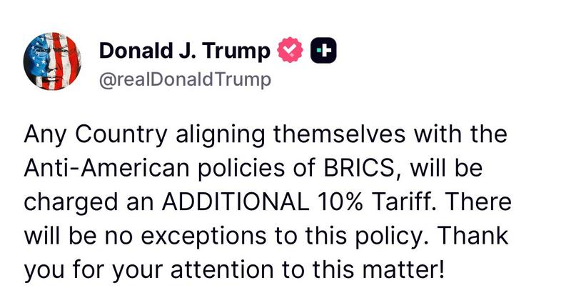 도널드 J. 트럼프 대통령이 미국의 국가 이익과 반하는 외교 노선을 따르는 국가들을 향해 강력한 통상 보복을 예고했다. 트럼프 대통령은 6일 자신의 공식 SNS 계정을 통해 “BRICS의 반미 정책에 동조하는 모든 국가는 10%의 추가 관세를 부과받게 될 것”이라며, “이 정책에는 예외가 없다”고 단호히 밝혔다.
