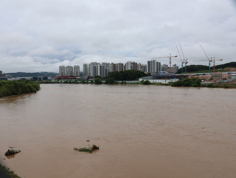 ♦ 2025년 7월 17일 충남 천안시 곡교천대교에서 촬영된 사진은 폭우로 인한 곡교천 수위 급상승과 범람 직전의 탁한 물 상황을 보여주며, 배경 건설 현장의 공사 지연과 침수 위험으로 안전 우려가 높아지고 있다.(사진=이노바저널 DB)