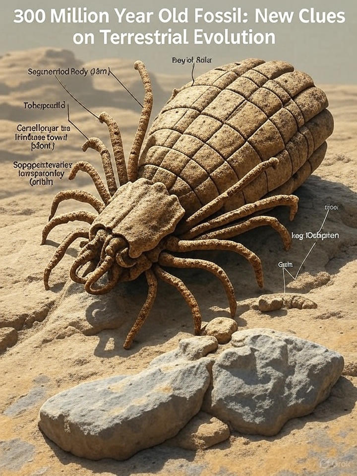 인포그래픽=본 기사 내용의 이해를 돕기 우해 AI로 생성한 것입니다.최근 재발견된 화석이 3억 년 전 최초의 비해양 로보포디아로 확인되며, 바다에서 육지로의 생물 진화 과정을 밝히는 중요한 단서를 제공했다. 이 화석은 이전에는 잘못 분류된 상태로 방치되어 있었다.