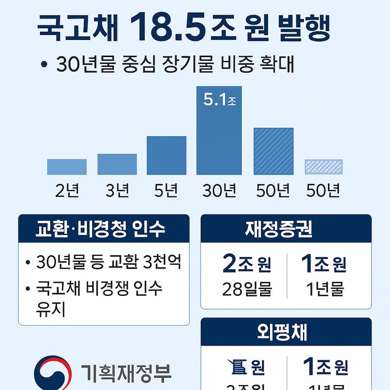 기획재정부는 8월 국고채를 총 185,000억 원 규모로 경쟁입찰 방식으로 발행하며, 이는 7월보다 3,000억 원 증가한 수치다. 이번 발행은 만기 구조의 다양화와 시장 유동성 강화를 함께 고려한 결정으로, 2년물부터 50년물까지 다양한 연물로 분산된다. 특히 30년물이 5.1조 원으로 가장 큰 비중을 차지했다.