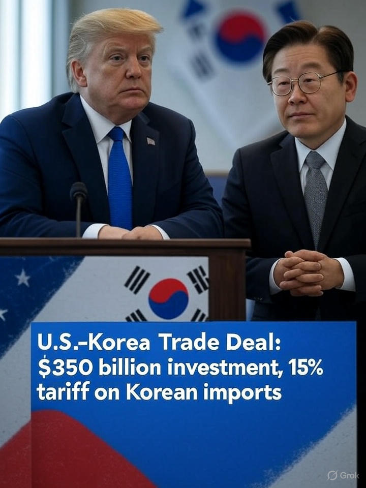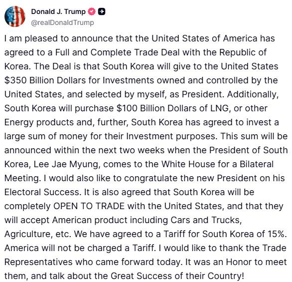 도널드 J. 트럼프 전 미국 대통령은 2025년 7월 30일 소셜 미디어를 통해 한국과의 ‘완전하고 포괄적인 무역 합의’를 발표했다. 그는 한국이 미국에 3500억 달러(약 455조 원) 투자와 1000억 달러(약 130조 원) 규모의 LNG 구매를 약속했다고 밝히며, 이를 “한국의 대미 투자 및 에너지 구매”로 강조했다. 트럼프는 한국산 수입품에 15% 관세를 부과하되, 미국산 제품은 무관세로 대응하며 경제적 이익을 극대화하려는 전략을 세웠다.