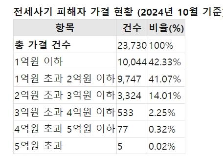 이 표는 주로 수도권에 집중된 피해자들의 보증금 분포를 보여주며, 대다수가 3억원 이하의 보증금을 가진 임차인임을 나타낸다.[출처: 국토교통부 보도자료]