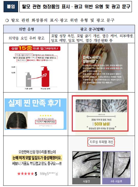 식품의약품안전처(식약처)는 2024년 10월 25일, 탈모 증상 완화를 표방하며 온라인에서 판매되는 화장품 중 허위·과대광고를 한 67건을 적발했다고 밝혔다. 이들 광고는 "모발 성장 촉진", "탈모 예방", "염증 개선" 등 실제 효과보다 과장된 내용을 담고 있어 소비자를 오인시킬 가능성이 있었다. 적발된 사례는 방송통신심의위원회에 접속 차단을 요청했으며, 27건은 화장품책임판매업자가 직접 광고한 것으로 현장 점검을 통해 위반 사항을 확인한 후 행정처분이 요청되었다.