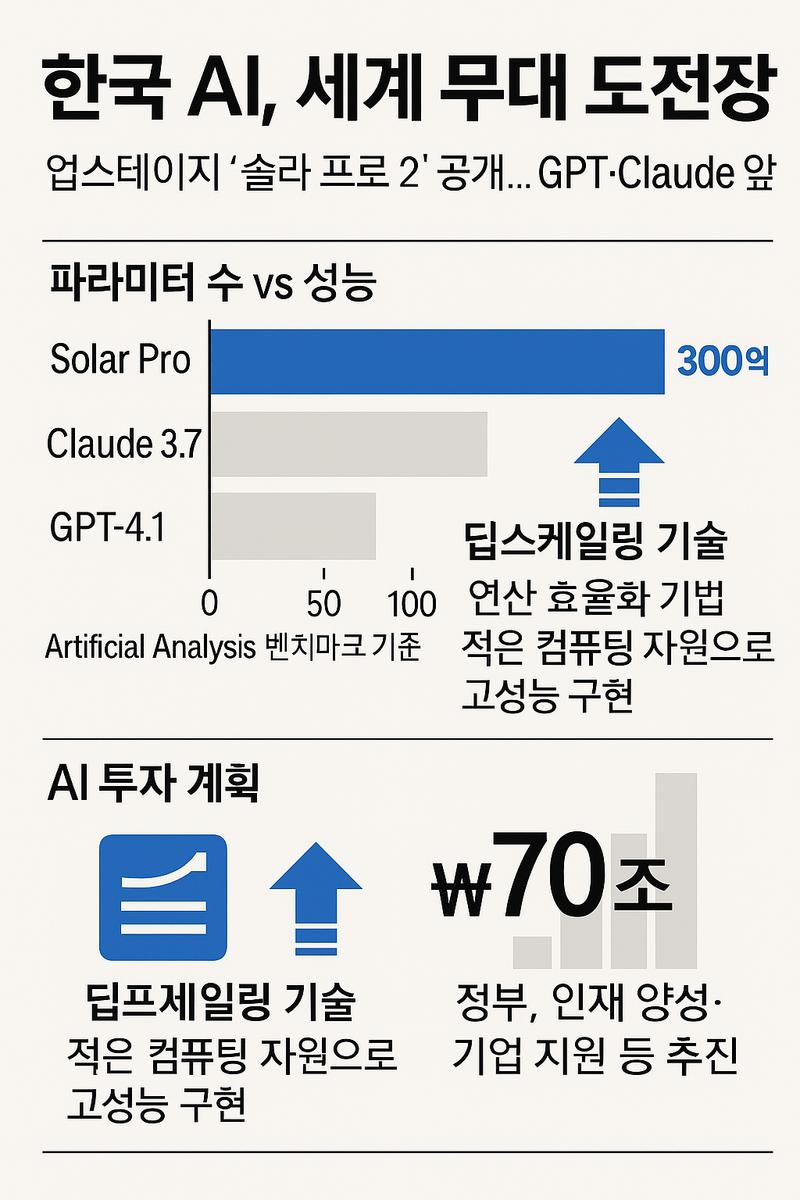 인포그래픽=기사 내용을 기반하여 AI로 생성하였습니다.한국 스타트업 업스테이지(Upstage)가 자체 개발한 인공지능 모델 ‘솔라 프로 2’를 발표했다. 덩치가 작은 모델임에도 세계 최상위 AI를 제치며 글로벌 시장의 이목을 끌고 있다.