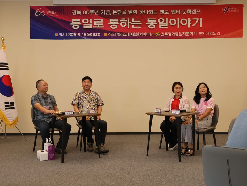 민주평화통일자문회의 천안시협의회(회장 안상국)는 8월 14일(목)부터 15일(금)까지 북한이탈주민과 자문위원, 관계자 등 45명이 참여한 가운데 ‘광복 80주년 기념, 분단을 넘어 하나 되는 멘토·멘티 문학캠프’를 개최하며 통일을 준비하는 소중한 자리를 마련했다.