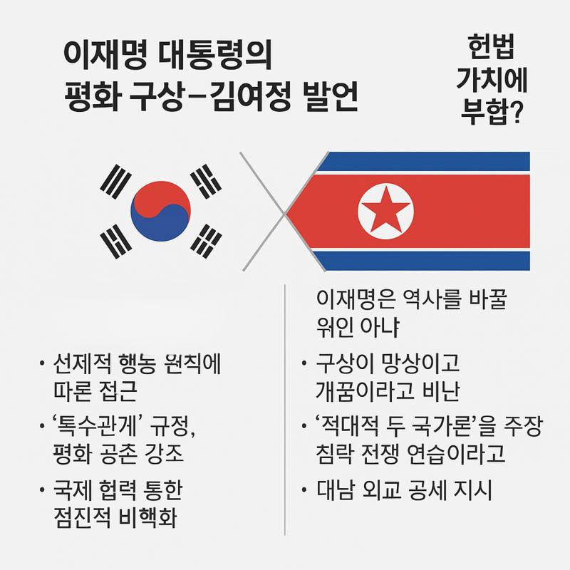 이재명 대통령이 광복절 경축사를 통해 ‘헌법 정신에 부합하는 평화 중심 대북정책’을 제시한 가운데, 북한 김정은 정권의 실질 대남정책은 “적대 본심”을 숨기지 않고 있다. 김여정의 직접적인 비난 발언은 남북한 간 인식의 간극과 헌법적 가치 충돌을 분명히 드러낸다.