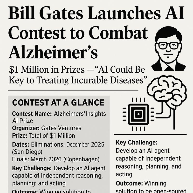 인포그래픽=기사 내용을 기반하여 AI로 생성한 것입니다.빌 게이츠가 알츠하이머 치료를 목표로 한 대규모 AI 경진대회를 출범시켰다. 총상금 100만 달러가 걸린 이번 대회는 전 세계 연구자들에게 개방되며, 우승 솔루션은 무료 공개될 예정이다.