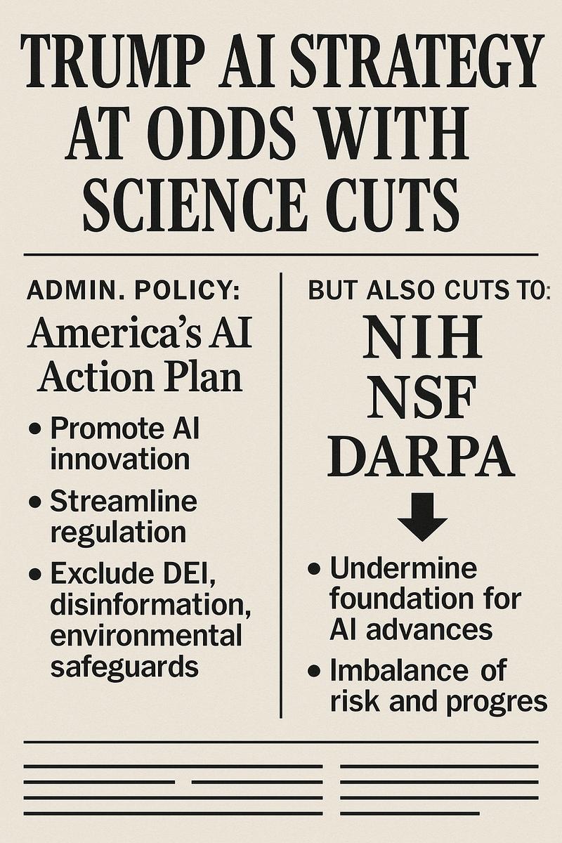 문제는 이러한 예산 삭감이 AI의 장기적 성장을 지탱하는 기초 과학 연구를 약화시킨다는 점이다. 더불어 행정부는 AI 규제에서 다양성·형평성(DEI), 허위정보, 환경 영향과 같은 핵심 요소들을 배제해 균형을 잃었다는 비판도 받는다.