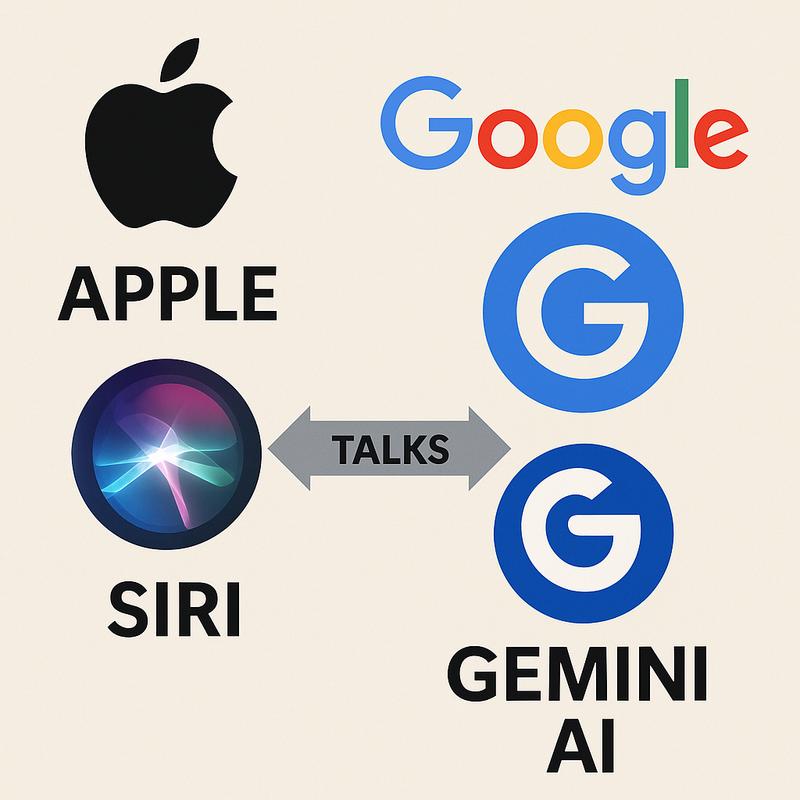 인포그래픽=이노바저널 AI 이미지 디자인애플(Apple)과 구글(Google)이 차세대 아이폰 음성비서 "시리(Siri)"에 구글의 Gemini AI를 통합하는 방안을 협의 중인 것으로 알려졌다. 업계는 이번 논의가 애플의 AI 전략 전환을 상징하는 중대 조치가 될 수 있다고 평가한다.