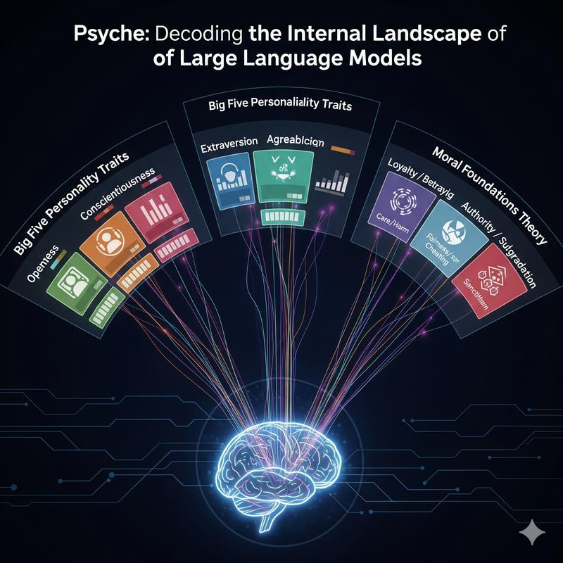 위 다이어그램은 Psyche의 작동 원리를 보여준다. 대규모 언어 모델(LM)의 내부 활성화 상태를 Psyche를 통해 투영(projection)하여, 이를 빅 파이브(Big Five) 성격 특성이나 도덕 기반 이론(Moral Foundations Theory)과 같은 인간의 심리학적 모델로 변환해 분석한다.
