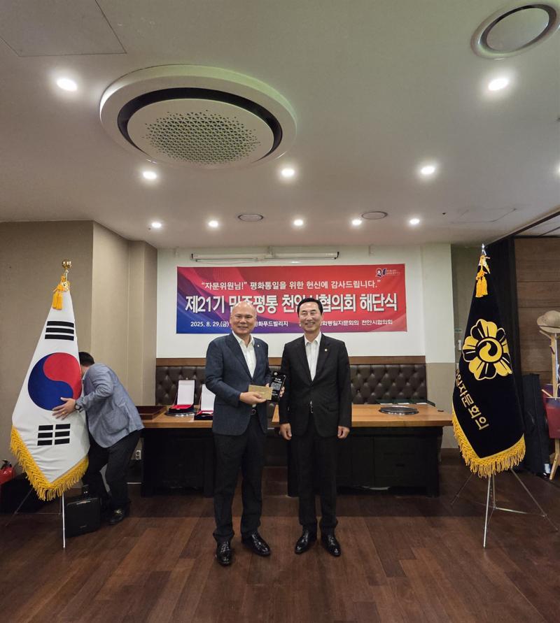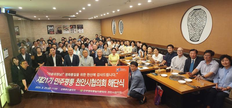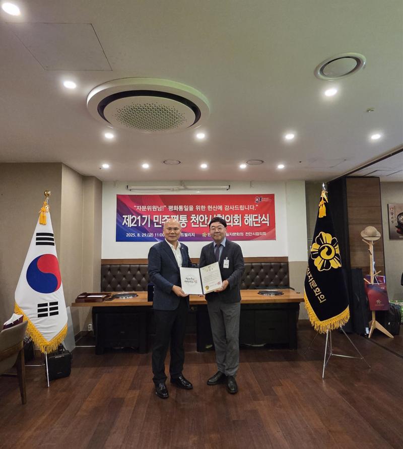 민주평화통일자문회의 천안시협의회가 8월 29일(금) 신화푸드빌리지에서 제21기 해단식을 열고 2023년 9월부터 2025년 8월까지의 활동을 정리했다. 행사에서는 유공 자문위원 표창, 북한이탈청소년 장학금 전달, 활동보고 등이 이어졌다.