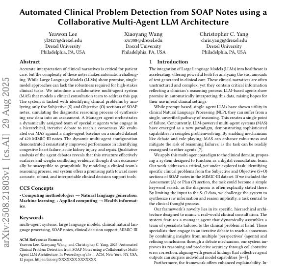 이 논문은 대형 언어 모델(LLM)을 기반으로 한 협력적 멀티에이전트 시스템을 활용해 의료 기록인 SOAP 노트에서 임상 문제를 자동으로 탐지하는 기술을 제안한다. 연구진은 매니저 에이전트가 진단 과정을 조율하고, 전문가 에이전트들이 논의를 통해 합의를 도출하는 방식을 도입했다. 이 접근법은 단일 LLM 기반 모델에 비해 진단 정확도, 강건성, 해석 가능성을 크게 향상시켰으며, 특히 복잡한 임상 데이터에서 뛰어난 성과를 보였다.