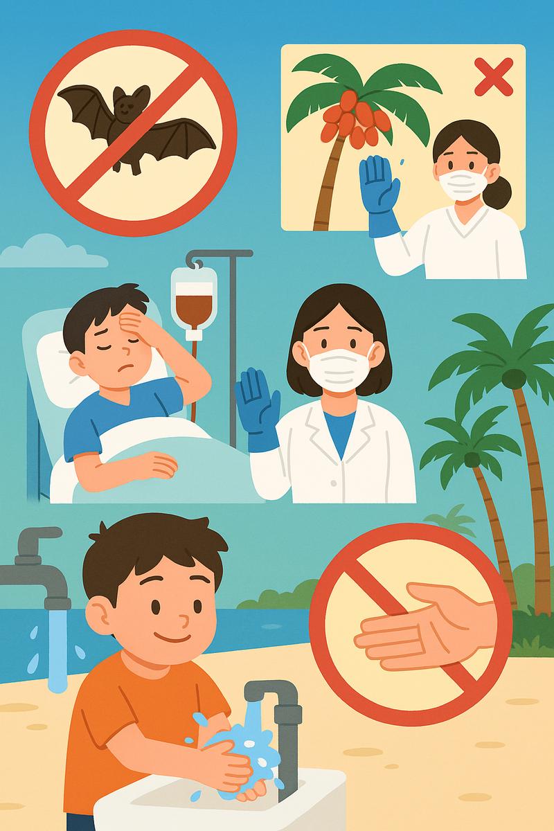 니파바이러스감염증은 과일박쥐나 돼지 등 감염된 동물과의 접촉, 오염된 대추야자수액 같은 식품 섭취로 전파될 수 있다. 또한 환자의 혈액이나 체액을 통한 사람 간 전파도 가능하다. 평균 잠복기는 4~14일이며, 초기에는 발열·두통·근육통 같은 증상이 나타나고, 이후 신경계 증상으로 악화돼 사망에 이를 수 있다.