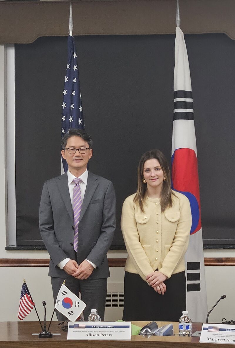 한국 외교부 이철 국제기구·원자력국장과 미국 앨리슨 피터스 국무부 민주주의·인권·노동국 부차관보(외교부 제공)