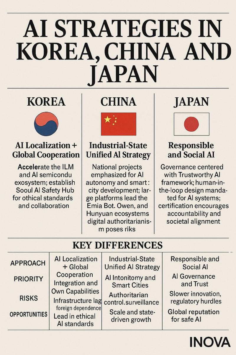 중국의 AI 자립화와 일본의 책임형 모델 사이에서, 한국은 독자적 AI 칩과 LLM 기술력을 확보하지 못할 경우 해외 플랫폼 종속 위험이 커진다.