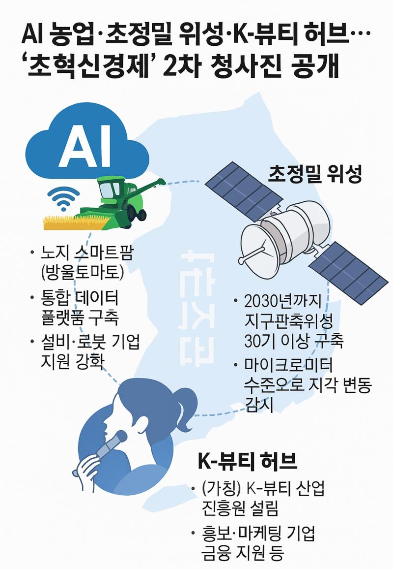 정부가 AI 솔루션을 통한 영농 최적화, 국가 안보의 핵심인 초고해상도 위성 기술 확보, K-뷰티의 글로벌 허브 도약을 골자로 하는 '초혁신경제 15대 선도 프로젝트'의 두 번째 추진계획을 발표했다. 미래 성장동력 확보를 위한 구체적인 로드맵이 공개되면서, 대한민국 경제의 체질 개선이 가속화될 전망이다.