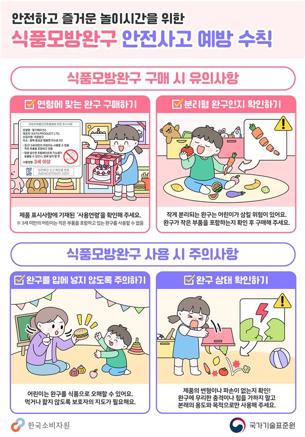 식품과 비슷한 모양으로 제작된 완구는 어린이가 식품으로 착각하거나 작은 부품을 삼키는 사고로 이어질 수 있어 주의가 필요하다. 소비자원과 국표원은 식품모방완구를 구매할 때 반드시 KC 인증 마크와 사용 연령을 확인할 것을 권고했다. 특히, 작은 부품이 포함된 완구는 3세 미만 어린이에게 치명적인 위험이 될 수 있어 보호자의 지도가 필수적이다.