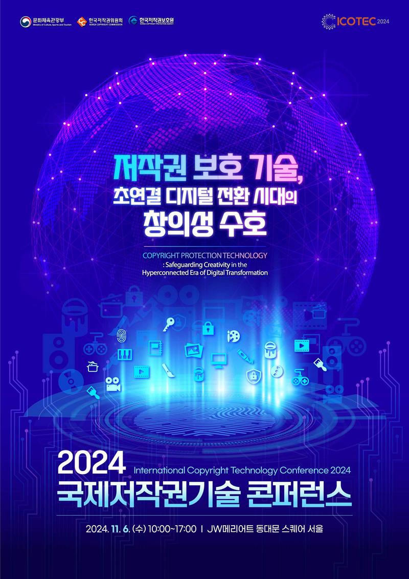 문화체육관광부(문체부)는 한국저작권위원회와 한국저작권보호원과 함께 11월 6일 서울 JW 메리어트 동대문 스퀘어에서 ‘2024 국제 저작권 기술 콘퍼런스(ICOTEC)’를 개최한다. 올해로 14회를 맞는 이번 콘퍼런스는 저작권 보호 기술의 발전 현황과 미래 쟁점에 대해 국내외 전문가들이 참여해 의견을 나누며, 온라인 생중계와 영문 통역도 제공된다.