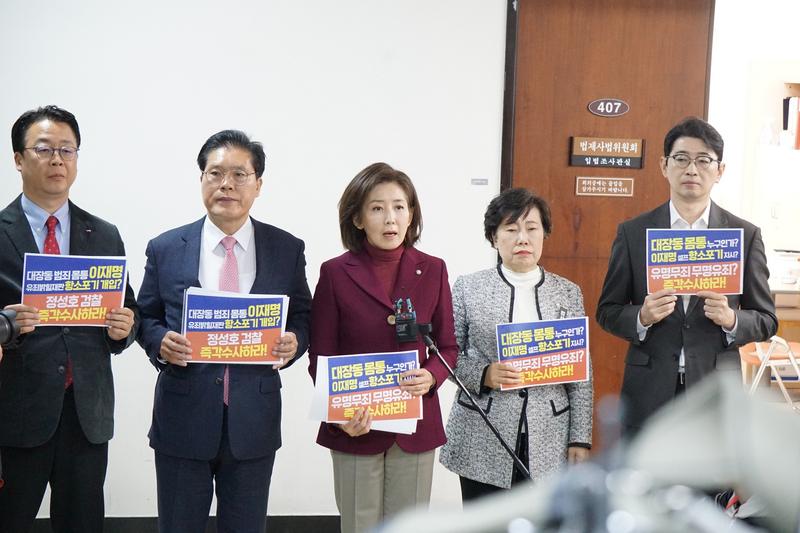 국민의힘당 소속 의원들이 대장동 개발비리 항소 포기 결정의 "대장동 몸통은 누구인가?라는 손피켓을 펼쳐들고 있다.(사진=나경원 의원 SNS 갈무리)대장동 개발비리 항소 포기 결정 이후, 검찰 내부에서 “권력에 굴복한 결정”이라는 강도 높은 비판이 쏟아지고 있다. 법무연수원의 정유미·박영진 연구위원(검사장급)은 노만석 검찰총장 권한대행의 사퇴를 공개적으로 요구하며 검찰 리더십의 붕괴를 경고했다. 국민의힘 또한 정성호 법무부 장관의 발언을 “법치주의 훼손”이라 규정하고 즉각 사퇴를 촉구했다.