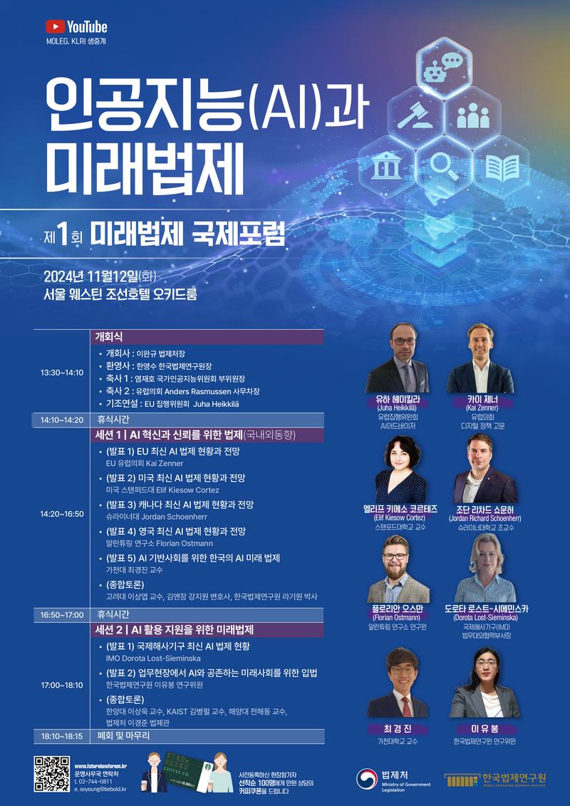 이번 포럼에서는 EU 인공지능법(AI Act)을 비롯한 주요국의 인공지능 법제화 동향과 한국의 인공지능 기본법 추진 현황이 주요 의제로 다뤄진다. 포럼은 ‘AI 혁신과 신뢰를 위한 법제’와 ‘AI 활용 지원을 위한 미래 법제’라는 두 세션으로 나누어 진행되며, 국내외 전문가들이 발제와 토론을 통해 AI 법제의 방향성과 미래 사회의 변화에 따른 법적 과제를 탐구할 예정이다.