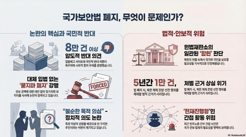 인포그래픽=이노바저널 AI 이미지 생성민주당을 중심으로 한 범여권이 2025년 12월 4일 대한민국 국회 입법예고 시스템을 통해 ‘국가보안법 폐지안’을 공식 예고하자, 국민적 반대 여론과 헌법재판소의 일관된 합헌 판단을 무시한 무리한 강행이라는 비판이 7일 정점에 달했다. 이는 분단국가의 현실 속에서 헌법이 부여한 국가의 생명·재산 보호 의무가 심각하게 훼손될 수 있다는 우려를 불러일으키고 있다.