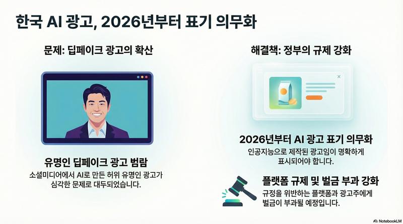 한국 정부가 인공지능(AI) 기술을 악용한 허위 정보와 금융 사기 확산을 막기 위해 전례 없는 강경책을 내놓았다. 정부는 오는 2026년부터 AI로 제작된 모든 광고에 대해 AI 사용 여부를 명확히 표기하도록 하는 제도를 의무화한다고 공식 발표했다. 이는 최근 소셜미디어(SNS)를 중심으로 급증하고 있는 유명인 사칭 딥페이크(Deepfake) 광고로 인한 사회적 손실을 막기 위한 특단의 조치로 해석된다.
