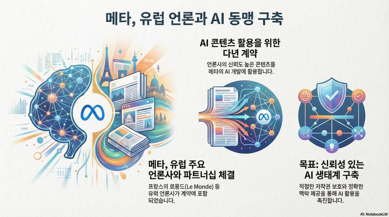 인포그래픽=이노바저널 AI 이미지 생성글로벌 소셜미디어 제국 메타(Meta)가 유럽의 대표적인 정론지들과 손을 잡았다. 메타는 프랑스의 유력 일간지 르몽드(Le Monde)를 포함한 유럽 주요 언론사들과 인공지능(AI) 콘텐츠 활용을 위한 다년 파트너십 계약을 체결했다고 밝혔다. 이는 AI 학습 데이터의 저작권 문제를 둘러싸고 빅테크와 언론계의 긴장이 고조되는 가운데 나온 획기적인 협력 사례로, 향후 글로벌 뉴스 저작권 시장에 중요한 선례가 될 전망이다.