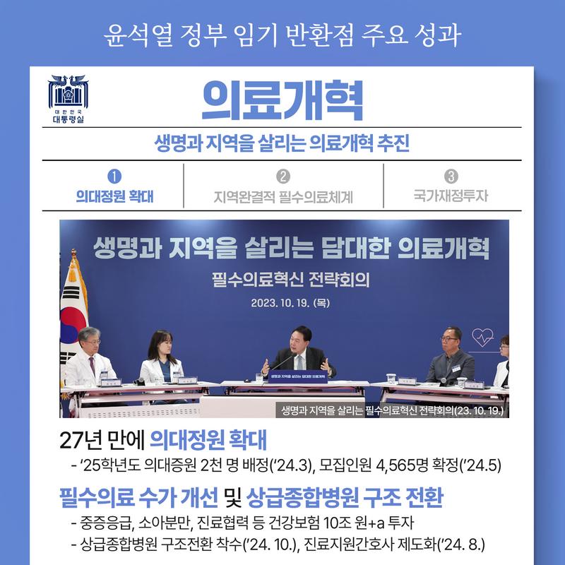 윤석열 정부는 임기 반환점을 맞아 의료 분야 개혁 성과를 발표하며, 국민의 생명과 지역 의료체계를 강화하는 데 중점을 둔 정책을 추진 중이라고 밝혔다. 주요 개혁 내용은 의대 정원 확대, 지역 완결적 필수의료체계 구축, 국가 재정투자 등으로 구성된다.