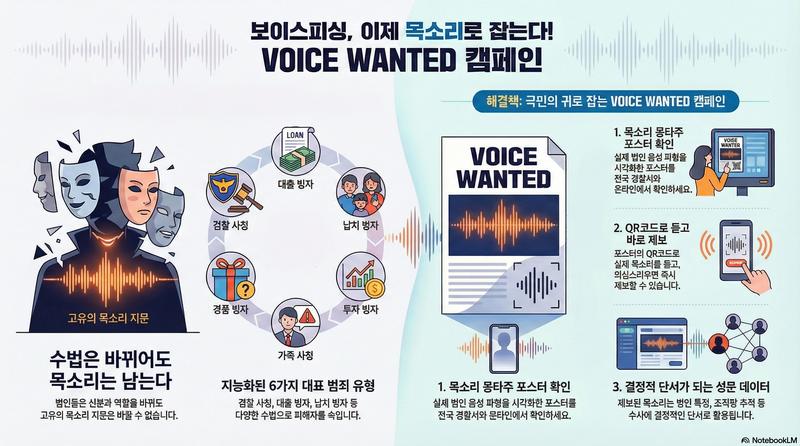 인포그래픽=이노바저널 Ai 이미지 생성경찰청이 보이스피싱 범죄 근절을 위해 범인의 ‘목소리’를 단서로 삼는 국민 참여형 캠페인을 본격 추진한다. 경찰청은 제일기획과 협업해 보이스피싱범 목소리 제보 캠페인 ‘VOICE WANTED’를 18일부터 내년 2월 11일까지 8주간 진행한다고 밝혔다.