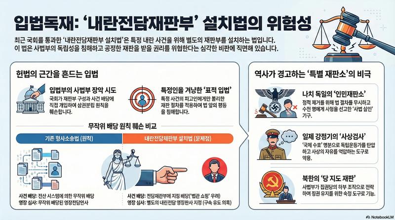 이 법안은 윤석열 전 대통령의 12·3 비상계엄 선포와 관련된 내란 사건을 전담할 특정 재판부를 서울중앙지법과 서울고등법원에 설치하고, 그 구성에 있어 입법부가 사실상의 영향력을 행사하거나 기존의 무작위 배당 원칙을 훼손하는 내용을 담고 있다.2 이는 표면적으로는 신속하고 공정한 재판을 명분으로 내세우고 있으나, 그 실질은 헌법상 삼권분립의 원칙을 무력화하고 사법부를 정치 권력의 하수인으로 전락시키려는 '입법 독재'의 전형을 보여준다. 입법부가 특정 사건의 재판부를 지정하고 심판관을 고르는 행위는, 축구 경기에서 한 팀이 자신에게 유리한 심판을 직접 선임하겠다는 것과 다르지 않으며, 이는 공정한 재판을 받을 헌법적 권리를 원천적으로 박탈하는 것이다.