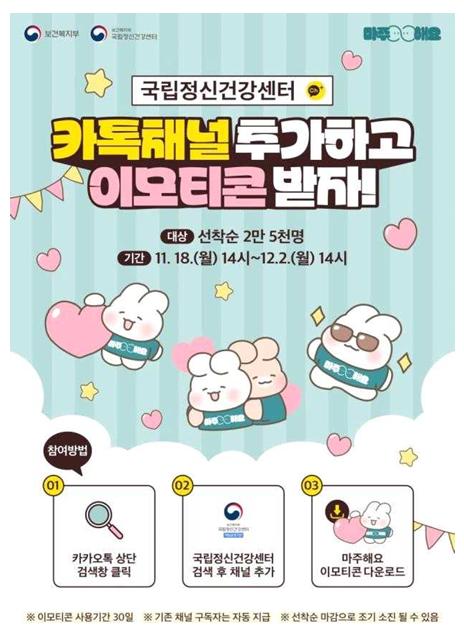 보건복지부 국립정신건강센터는 11월 18일 오후 2시부터 카카오톡 이모티콘 "우리 함께 마주해요"를 선착순 2만 5000명에게 무료로 배포한다고 밝혔다. 이번 이모티콘은 정신건강 인식개선 브랜드 "마주해요"의 홍보 활동의 일환으로 기획되었으며, 일상 속에서 마음 건강을 쉽게 관리할 수 있도록 돕는 메시지를 담고 있다.