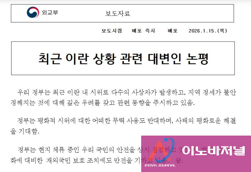 한국 정부가 2025년 12월 28일부터 이란 전역에서 벌어진 반정부 시위에 대한 잔인한 진압으로 최소 3,000명의 사망자가 발생한 가운데, 특별 브리핑 없이 대변인 간단한 논평만 발표해 외교 무능이라는 비판을 받고 있다.